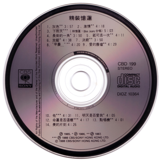 (p) 1986 *(p) 1987 **(p) 1988 CBS/Sony Hong Kong Ltd. (c) 1989 CBS/Sony Hong Kong Ltd. made in Japan.